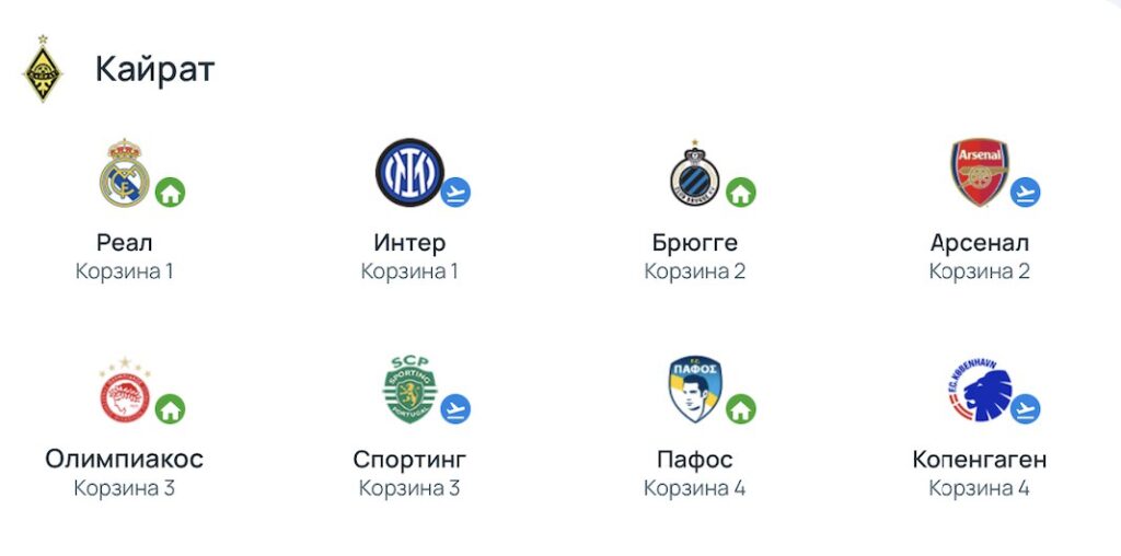 Казахстанский клуб проведёт сразу четыре домашних матча в Алматы. На стадионе «Кайрат» примет мадридский «Реал», бельгийский «Брюгге», греческий «Олимпиакос» и кипрский «Пафос».