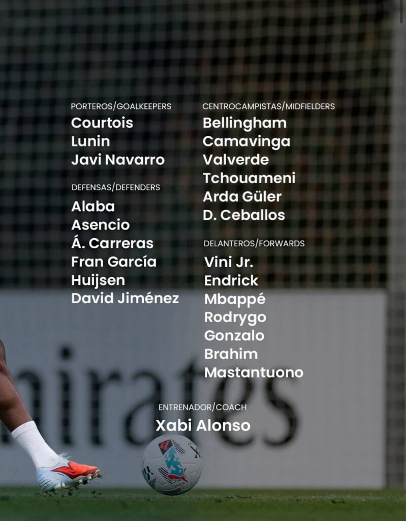 Мадридский клуб опубликовал заявку на игру второго тура группового этапа Лиги чемпионов против «Кайрата», которая пройдёт 30 сентября на Центральном стадионе Алматы. В списке — главные звёзды «сливочных» Джуд Беллингем, Килиан Мбаппе, а также Родриго и ряд ключевых исполнителей основы.